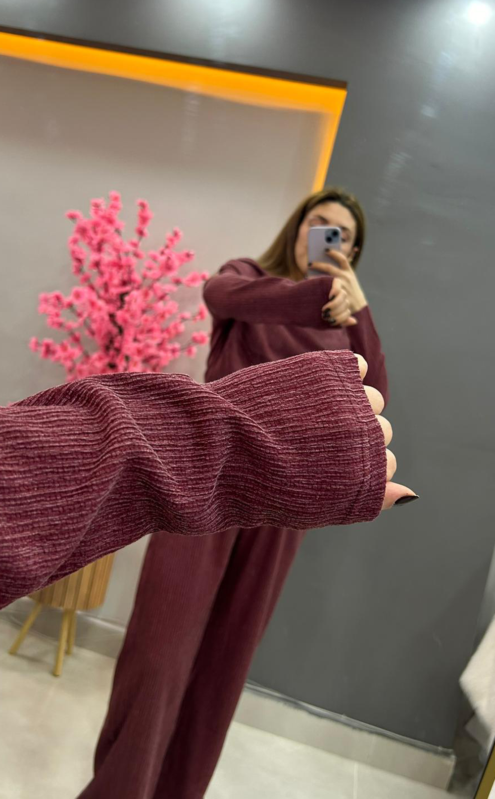 Kırmızı renkli likralı kumaş takım, şıklığı ve rahatlığı birleştirir. Hem ofis hem de günlük kullanım için uygundur.
